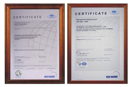 The firm assurance of precision and quality control of products are the establishment of material physical chemical lab, measuring center and the physical-chemical analysis instruments including Alfin piston ultrasonic detector, piston oil cooling channel detector, engine power tester, piston skirt outline measuring apparatus, piston roughness of surface measuring instrument, projecting apparatus, universal instrument microscope, metallograph, horizontal CNC and special-shaped bore hole CNC, skirt graphite-spraying and -coating technology, hardening anodic oxidation in top and graphite screen printing machine imported from Germany, spectro direct-reading spectroscopes, Hommelwerke roundness testers, Swiss three-dimensional meters, Tokyo precision profilers of Japan, roughness testers, etc. In May 2007, the Shanghai Jialaidun Company was admitted to ISO9001 certificate, ISO/TS16949 certificate and the RWTüV system GmbH certificate. IN 2008, our trademark JLD was admitted to the Chinese Famous Trademark. Thus the Shanghai Jialaidun Company became the first enterprise to be awarded such certificate among the non-governmental piston enterprises at home.