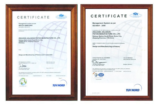 We have the facilities such as physical-chemical analysis instruments such as engine power tester, piston skirt outline measuring apparatus, surface measuring instrument for piston roughness, projecting apparatus, universal instrument microscope, metallograph, etc. In order to join in the international standard quality management system, the company started to execute ISO9000 Quality Management System in March 1997, and became one of the five companies executing ISO9000 in Ruian City. Based on the certification of ISO9000, the company also started to execute QS9000 and VDA6.1 in March 2003. The company was also admitted to ISO9001 certificate, QS9000 certificate and VDA6.1 quality system certificate and the RWTüV systems GmbH certificate. On the basis of the above quality systems, the company executed the ISO/TS16949 and was admitted to Germany RWTüV certificate in August 2006. The precision and strength of our products have reached the leading level in the same industrial field of its kind at home. The company was awarded the titles of AAA Level Credit Enterprise and Al Credit Customer by the ICBC Wenzhou Branch.